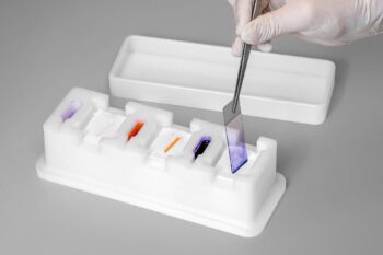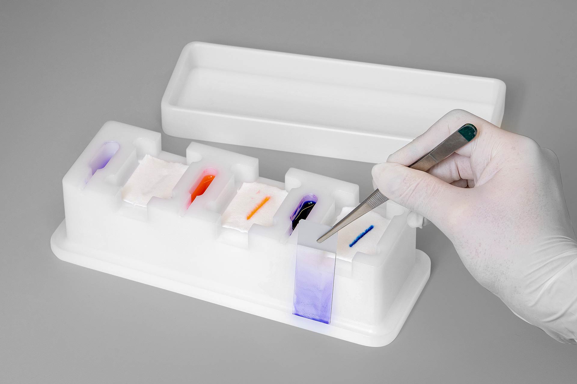 Die dreistufige Färbebank dient zur einfachen Färbung von Objektträgern. Das durchdachte System kommt dabei mit wenig Färbemittel aus. So können Farbwechsel, bedingt durch verschmutzte oder zellreiche Präparate, mit weniger Farbverlust vorgenommen werden. Zwischen den einzelnen Tauchvorgängen werden die Objektträger auf den dafür vorgesehenen Zellstofftupfern abgetropft, bevor sie zum Trocknen auf die Abtropfrinne gestellt werden.