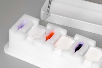 Die Färbemittelvertiefungen sind mit einer speziellen Ausgussvorrichtung ausgestattet, die das Auswechseln der Lösungen vereinfachen. Allfällige Tropfen werden von der Abtropfrinne aufgefangen.
