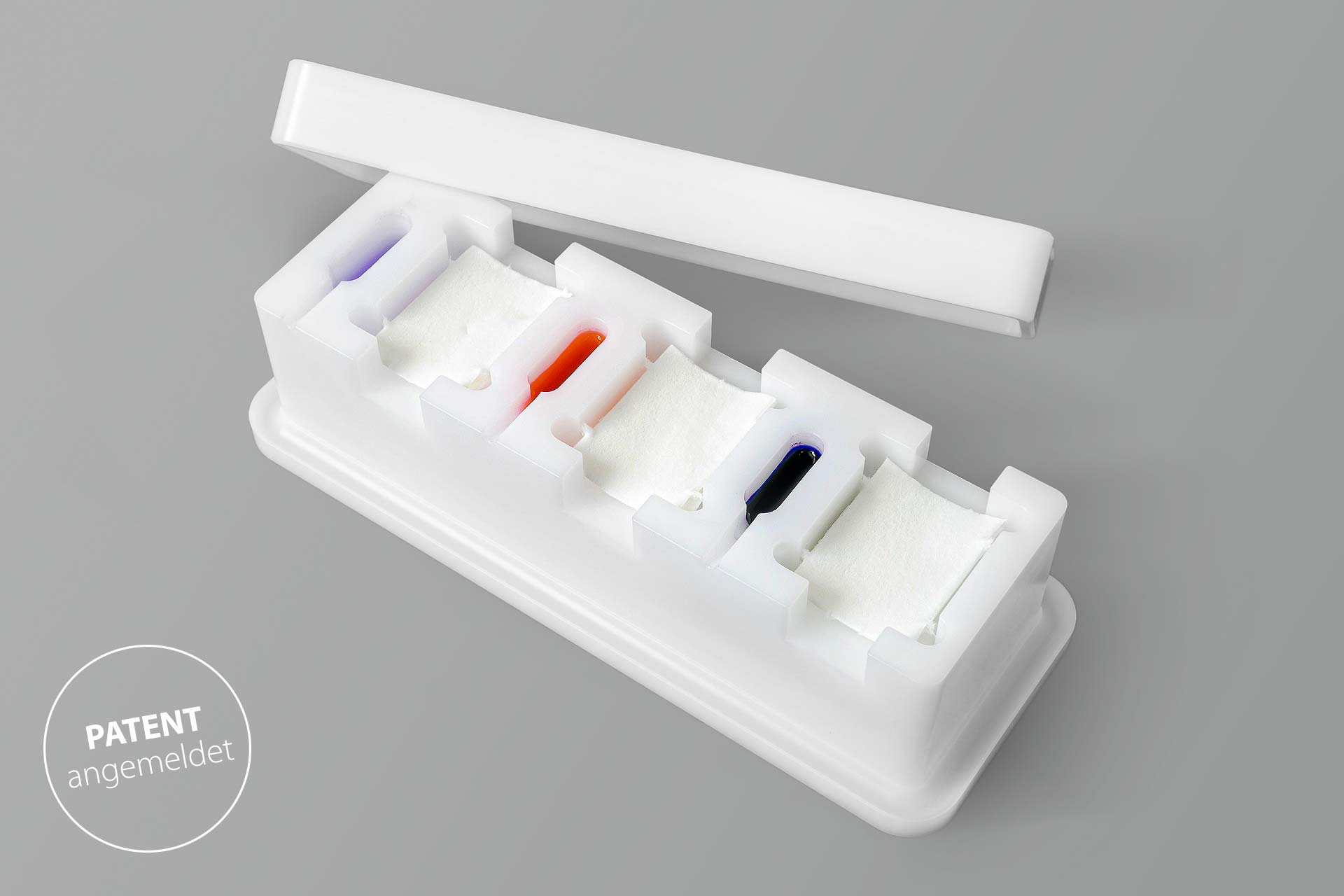 Zum Schutz der Färbemittel vor Verdunstung wird ein Deckel zum Abdecken der Färbebank mitgeliefert.